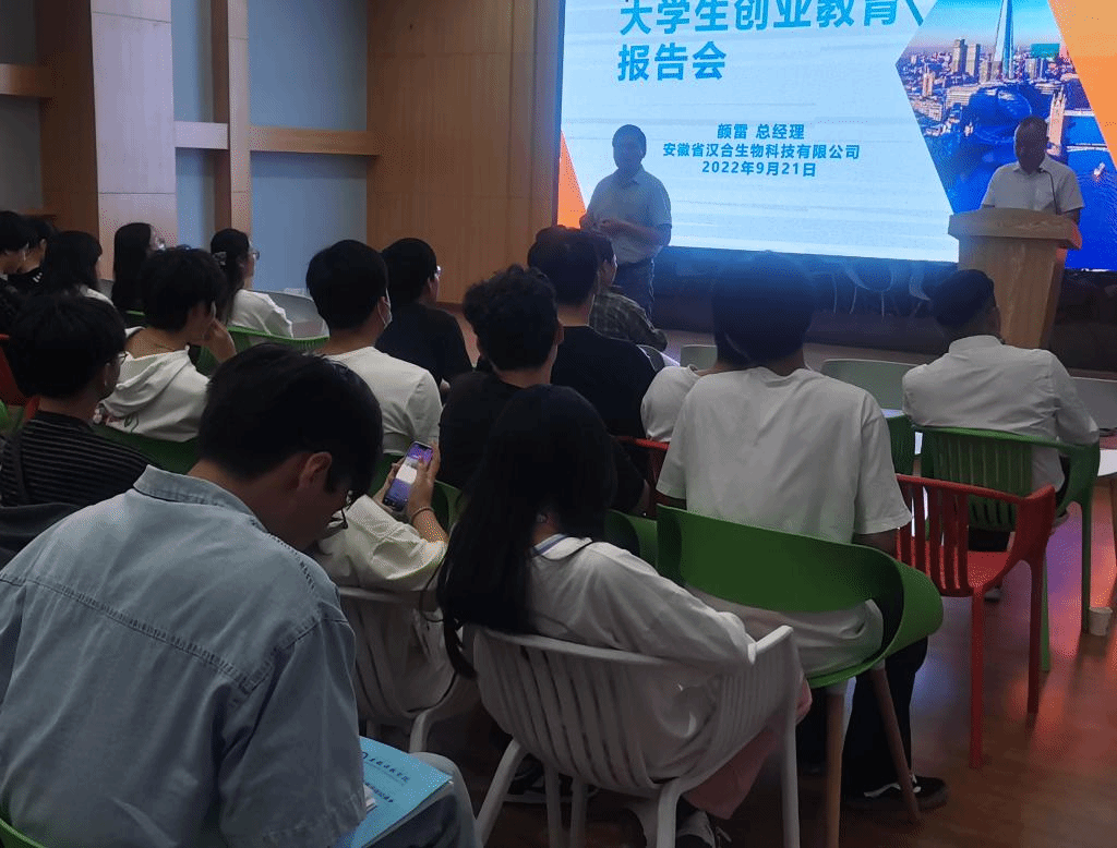 为更好地推动开云线上官网_开云(中国)创新创业教育工作,增强同学们的创业意识和能力,9月21日下午,教务处 创新创业学院邀请安徽汉合生物科技有限公司总经理、蚌埠市“创业之星”颜雷在龙湖校区众创空间路演厅给同学们做了一场别开生面的创业辅导报告。报告会由教务处副处长、创新创业学院副院长高青海主持,来自龙湖校区六个学院的学生代表和众创空间2022年入驻团队所有成员100余名学生聆听报告。