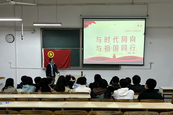 10月22日,动医241班团支书姚珏在新A103开展“与时代同向,与祖国同行”主题团日活动。会上,她以中华民族精神的基本内涵作为导入,随后分别从爱国的本质,爱国血脉,红色基因,三个方面来学习,并指出“作为新时代的青年学子,应当为中华民族伟大复兴的中国梦而努力奋斗”。最后,就新时代青年如何爱国这一问题与同学们一起交流。
