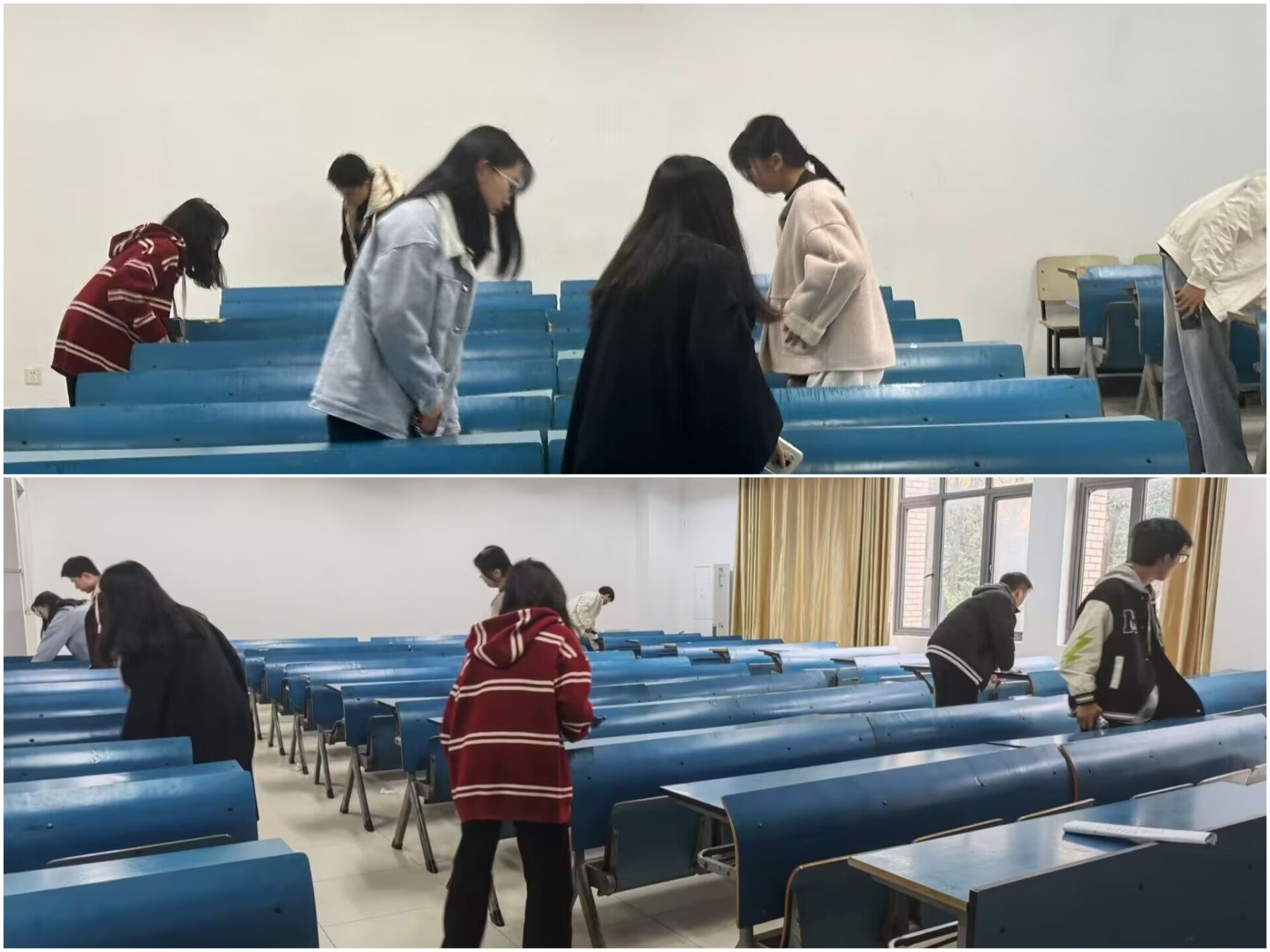 学生会工作人员有条不紊、一丝不苟地细致检查每一间教室的各项设施状况,包括钟表是否正常运行、走时是否精准,教室桌椅有无损坏、松动情况,对于发现的问题,认真做好记录并上报相关部门。