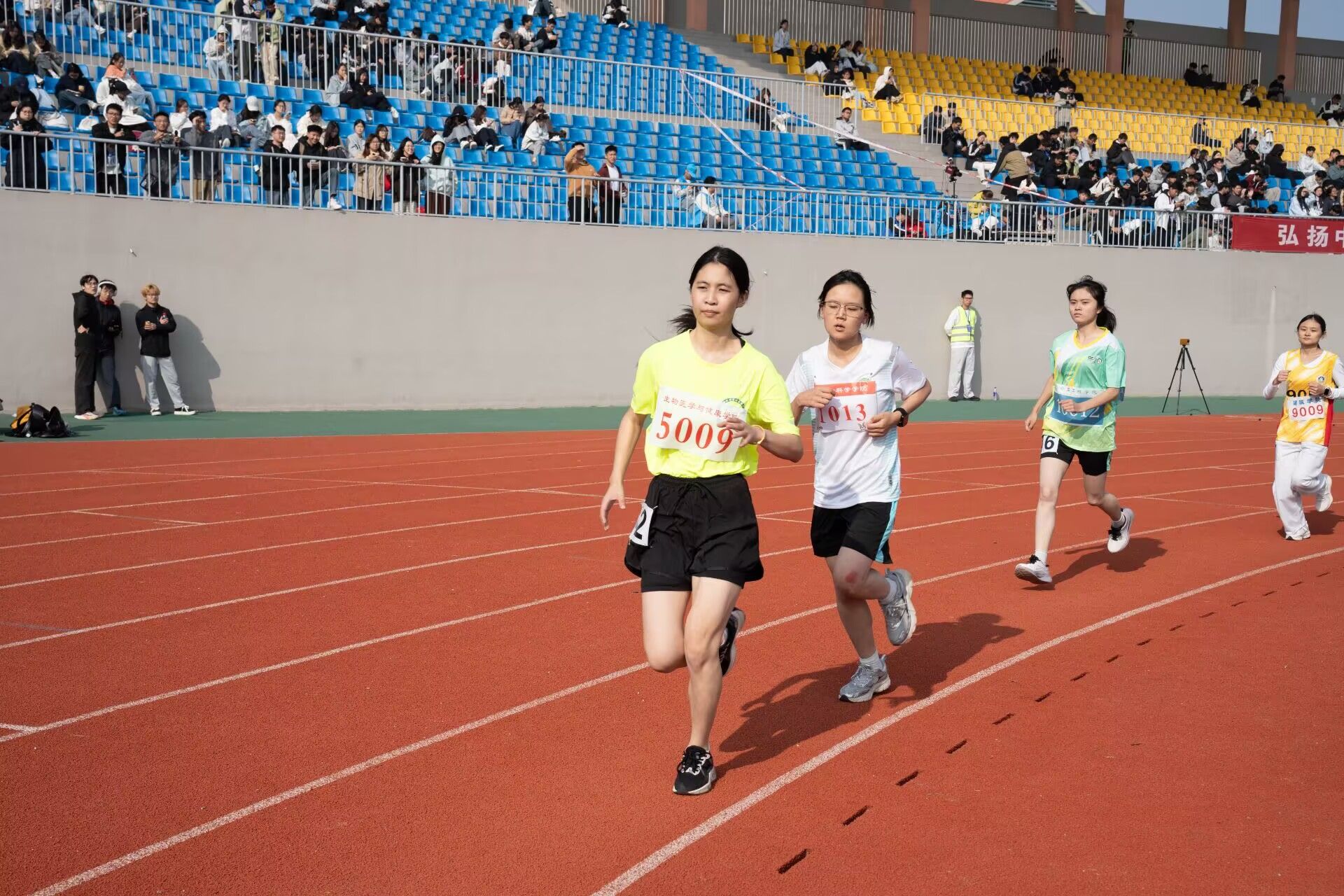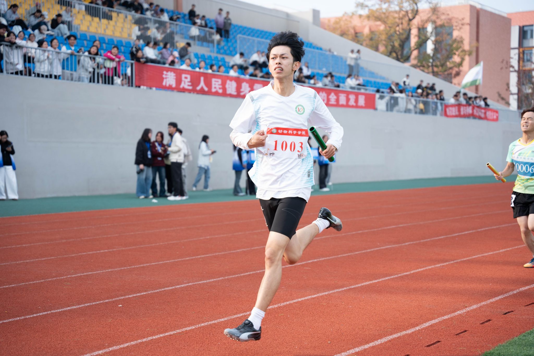 赛场上,动科院的运动员们努力拼搏,不松懈、不放弃的青春活力洒满赛场。男子径赛项目中,马立乐在男子5000米中以17分0.63秒的优异成绩打破校运会纪录,汪文军在该项目中取得第六名的成绩,潘镇在男子100米中取得第六名,姜延、左伟在男子400米中分别取得第四名、第五名,谷永祥在男子1500米中取得第六名,左伟在男子800米中取得第五名。在田赛方面,曹道勇在男子铅球中勇夺第一,韦金旺在男子跳远中获得第四名的好成绩,尚学政在男子三级跳中获得第六名的好成绩。团体项目中,动物科学学院男子团体在4×400、4×100中取得双第四的名次。