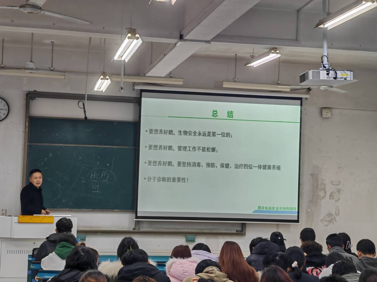 毕少帅以动物医学专业人才培养的目标及动物医学专业学生的社会职能为切入点,通过鹅业创业及实践的讲解,让学生了解皖西白鹅的饲养管理、科学免疫以及常见疾病的诊断与防控策略。他立足实践,从鹅的饲养管理入手,深入讲解了饲养过程和疫苗接种中的关键环节,并提出了科学合理的建议。同时,他以鹅痛风、浆膜炎、梭菌性肠炎等常见疾病为例,结合自身社会实践经历,鼓励同学们树立明确目标,珍惜大学时光,勤奋学习,不断提升专业素养,努力成长为推动行业发展和社会进步的有用之才。报告会气氛热烈,现场掌声不断。