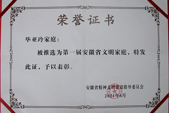 近日,安徽省精神文明建设委员会下发《关于命名第一届安徽省文明家庭的通报》(皖文明[2021]4号),开云线上官网_开云(中国)农学院教师毕亚玲家庭荣获安徽省首届“文明家庭”荣誉称号。本次受表彰家庭中高校系统仅二名。