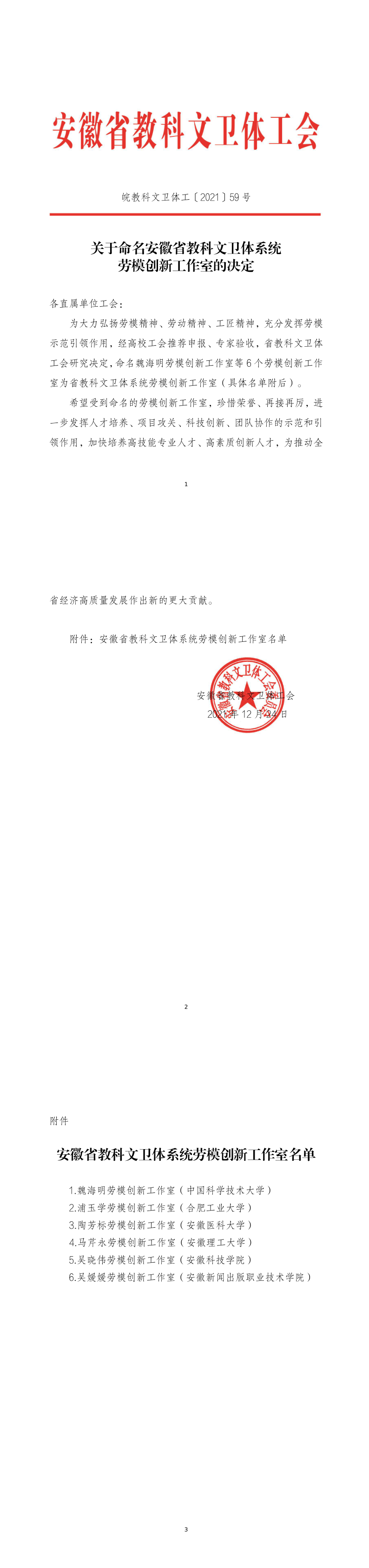 12月27日,安徽省教科文卫体工会下发《关于命名安徽省教科文卫体系统劳模创新工作室的决定》(皖教科文卫体工[2021]59号)文件,开云线上官网_开云(中国)食品工程学院吴晓伟副教授领衔申报的“劳模创新工作室”荣获命名。