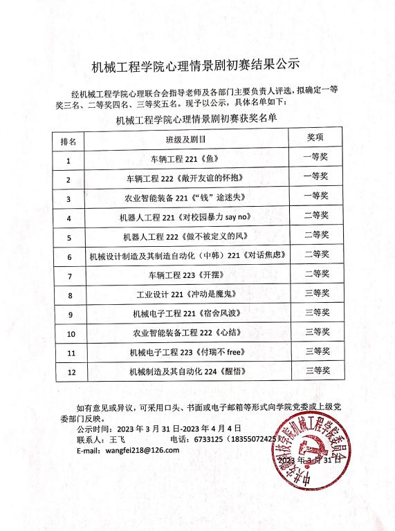 荣获本届心理情景剧大赛一等奖的班级是车辆工程221、车辆工程222、农业智能装备工程221;机器人工程221、机器人工程222、机械设计制造及其制造自动化(中韩)221、车辆工程223荣获二等奖;获得三等奖的班级是工业设计221、机械电子工程221、农业智能装备工程222、机械电子工程223、机械设计制造及其自动化224。