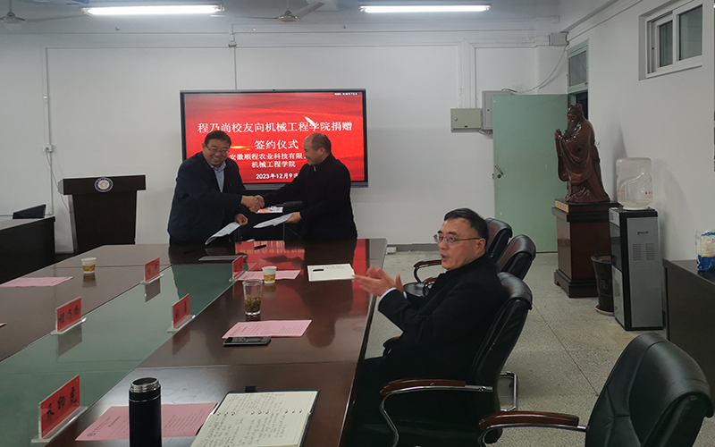 12月9日下午,机械工程学院1995届优秀毕业生、安徽顺程农业科技有限公司总经理程乃尚向母校无偿捐赠10万元,助力母校建设,充分展现了校友对母校的深情厚谊。捐赠仪式由机械工程学院党委书记姚勇主持,党委委员、副院长乔印虎、党政办主任王飞等参加。
