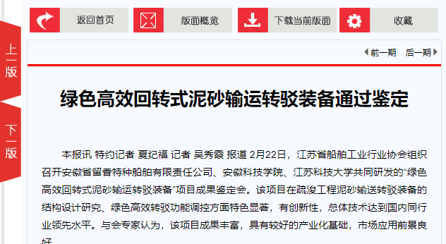 该装备在疏浚工程泥砂输送转驳装备的结构设计研究、绿色高效转驳功能调控方面特色显著,具有创新性,总体技术达到国内同行业领先水平,已成功入选安徽省首台套成果优先推荐库。目前,该成果已在行业中推广应用,取得了良好的经济效益和社会效益,被中国船舶报、江苏省船舶工业行业协会、江苏科技大学等媒体报道。