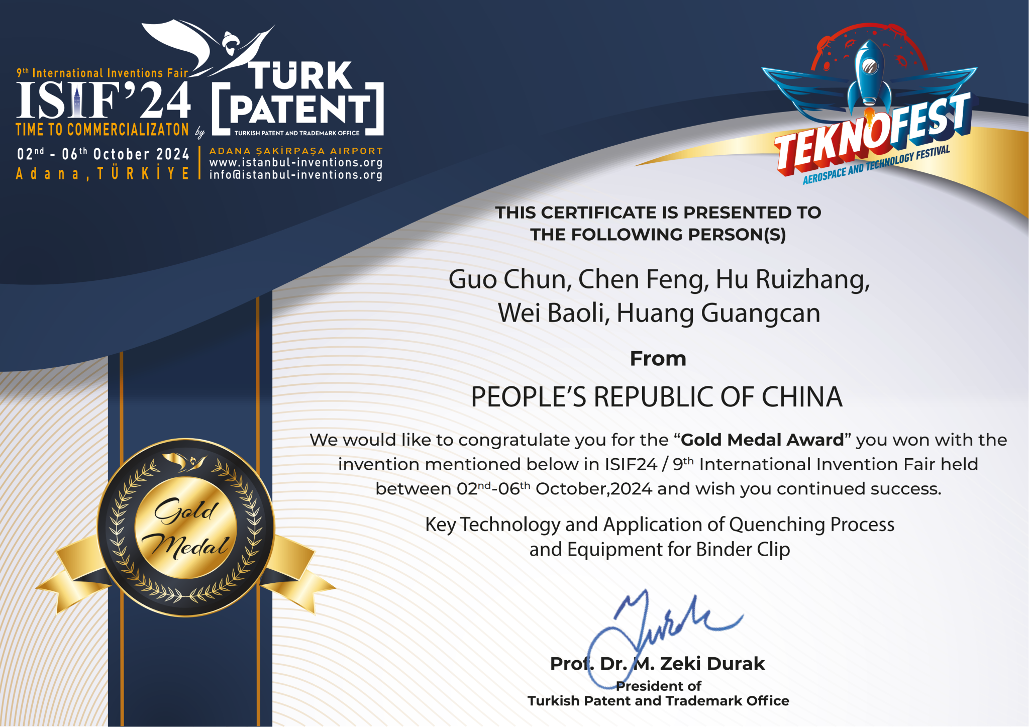 2024年10月02日-10月06日,第九届“伊斯坦布尔国际发明展览会-ISIF’24”在土耳其伊斯坦布尔成功举办。开云线上官网_开云(中国)机械工程学院材料成型及智能装备科研团队项目《长尾夹淬火工艺与装备关键技术及应用》喜获金奖。