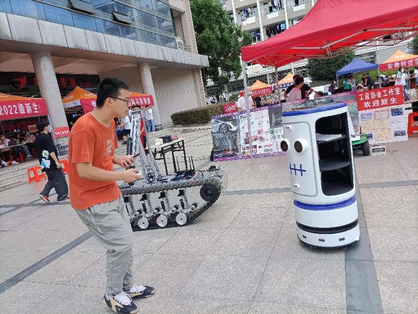 在迎新现场,一名大一新生正在跟学长进行“智能自主移动机器人”交流和学习。这9台机器人是机电控制工程系周玉强老师带领机器人工程专业本科生,从元器件选型到硬件调试,再到控制系统,一直到应用系统,每一步都是学生自己亲自动手完成的,极大地提高了本专业学生对机器人复杂工程的分析和解决能力。