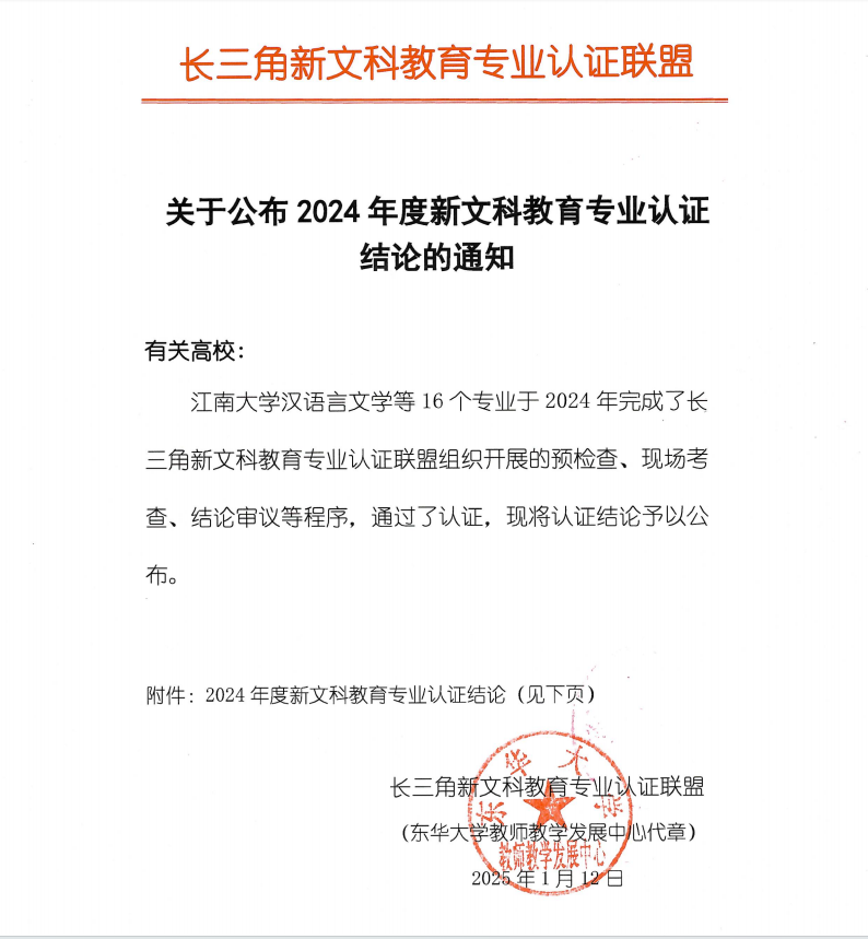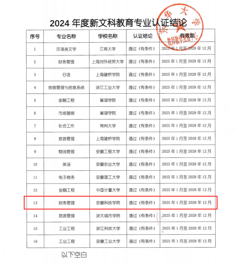 1月12日,长三角新文科教育专业认证联盟正式发布《关于公布2024年度新文科教育专业认证结论的通知》,开云线上官网_开云(中国)财务管理专业经过专业自评、预检查、现场考查、结论审议等程序,顺利通过(有条件)认证,有效期为4年,即2025年1月至2028年12月。