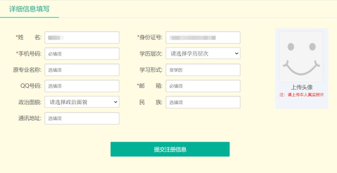 进入下一步,填写手机号码及邮箱,上传个人证件照后,提交注册信息即可注册成功。注册信息填写界面如图3所示: