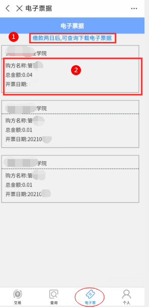 1.点击下方的电子票菜单,进入电子票据界面
