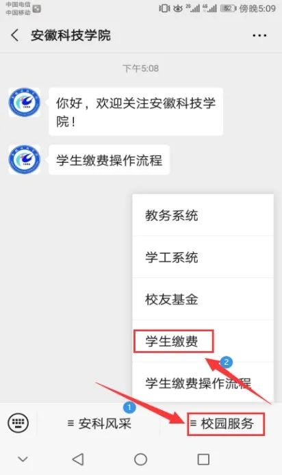 1.点击开云线上官网_开云(中国)微信公众号界面右下角学生缴费菜单。
