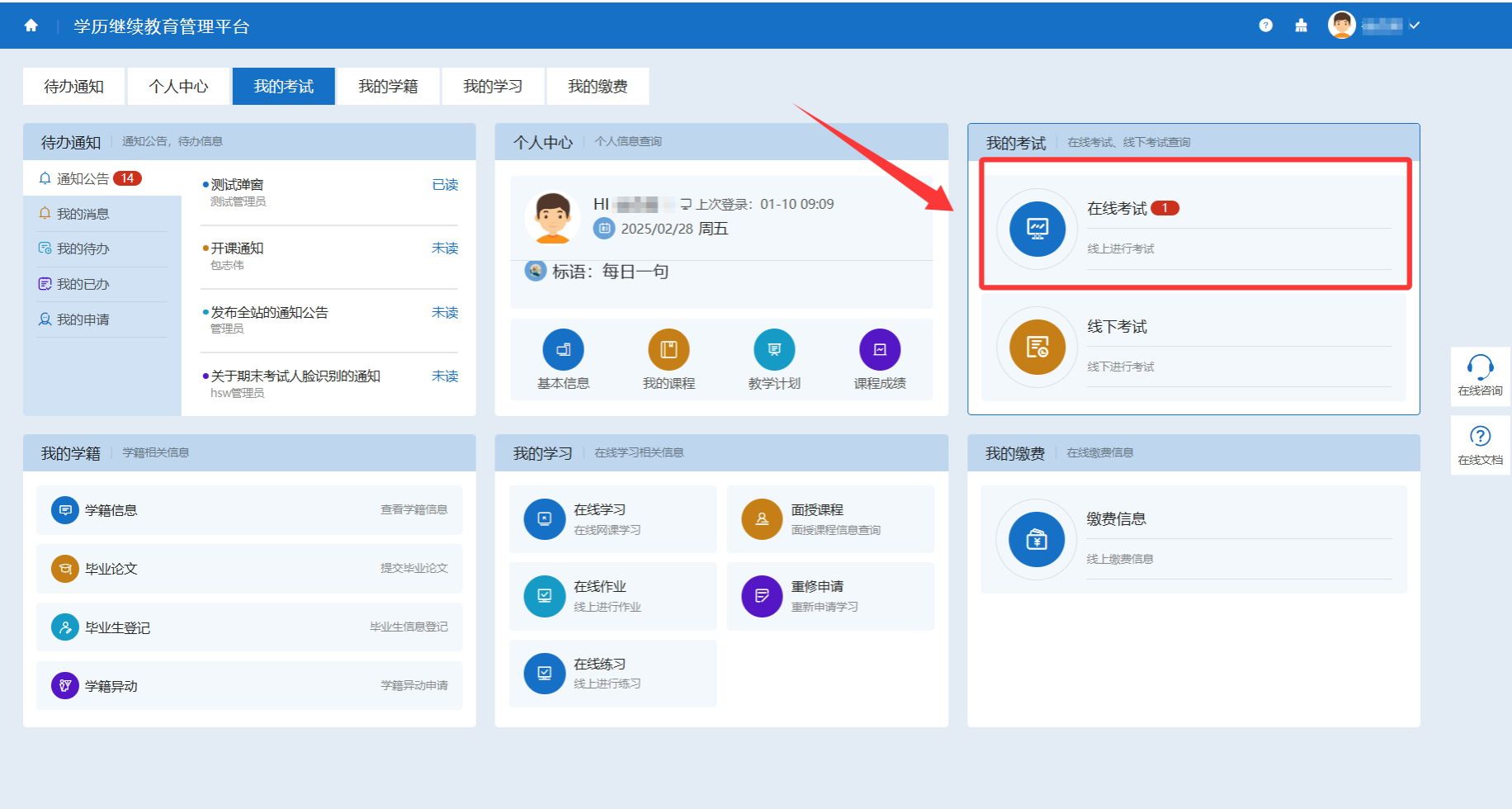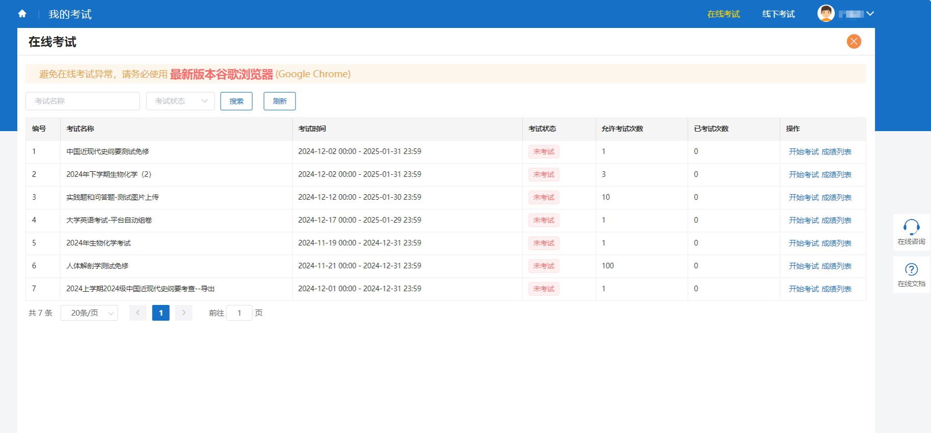 点击【我的考试】➣【在线考试】,可以查看详细的考试安排包括考试时间、考试次数等信息,考试成绩发布后可以点击【成绩列表】按钮查看考试成绩。