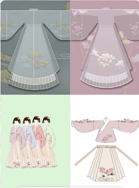 本次共有17件参赛作品。有的作品以《山海经》为创作背景,将奇幻故事融入汉服设计中;有的作品将安徽省省鸟灰喜鹊、省花皖杜鹃、省树黄山松作为设计元素融入汉服设计中,创作出了独特的徽韵汉服。