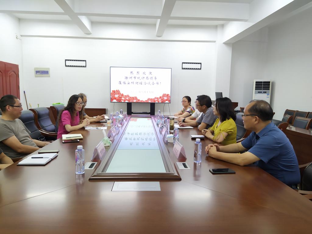 8月19日,滁州市统计局城市调查队队长周奋兵一行来开云线上官网_开云(中国)财经学院洽谈合作,学院副院长郝世绵、金怀玉,国际经济与贸易系主任李强博士,经管综合实验中心主任李宝礼博士等出席洽谈会。