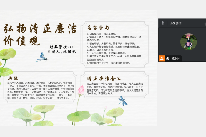清正廉洁是中国传统道德的一个基本规范,被视为“国之四维”之一,又被视为“仕者之德”。为加强大学生对廉洁价值、廉洁规范、廉洁风尚的思想认同和精神追求,寒假期间,财经学院组织开展了“寻找廉洁典型”寒假社会实践活动。