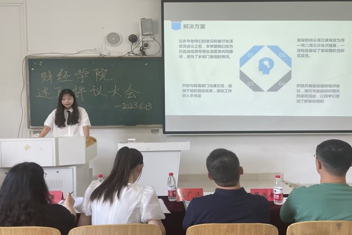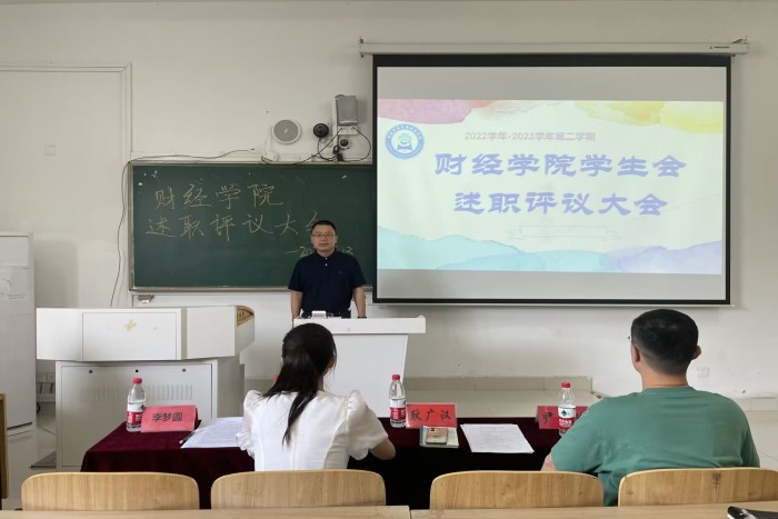 为深入贯彻落实学生会组织深化改革的要求,进一步加强学生队伍建设,不断提高学生干部的责任意识、服务意识和大局意识,财经学院于6月13日下午在致知楼C108组织开展2022-2023学年第二学期学生会述职评议。财经学院党委副书记耿广汉、团委书记薛枫、辅导员尹成超、丁雨妍,校学生会主席团成员李梦圆应邀担任本次述职评议的评委。会议由院学生会执行主席原红云主持。