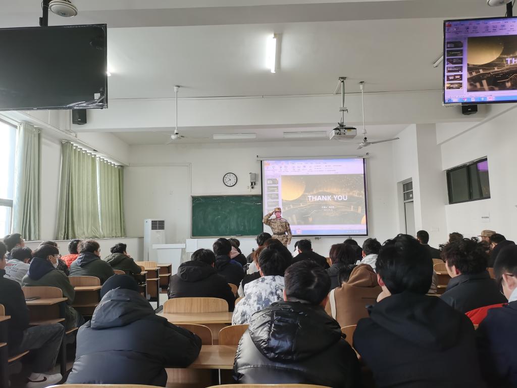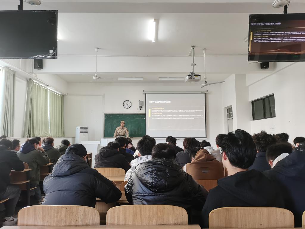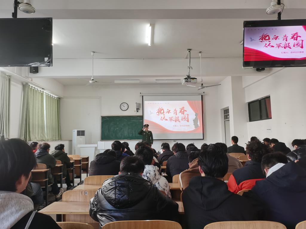 王天云指出,依法服兵役是中华人民共和国每一个公民义不容辞的责任和义务。军营是一所培养人才的大学校,是一座锻炼人才的大熔炉。投笔从戎、参军报国,是磨砺人生的好路径,是实现理想抱负的好方法,希望同学们踊跃参军,报效祖国,在绿色军营里淬炼成钢,书写绚烂无悔的青春篇章。随后介绍了应征入伍政策及学院大学生应征入伍的整体情况,并同与会学生进行交流互动。