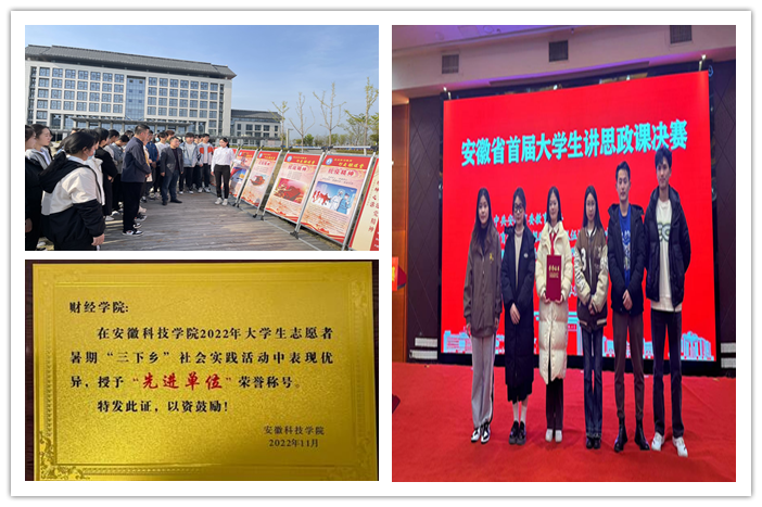 突出价值引领,筑牢学生家国情怀根基。坚持党建引领,团学带动,发挥党建聚力赋能优势。通过“行走的党史微课堂”“青年红色筑梦之旅”“跟随镜头,看江淮大地新时代十年新变化”等实践载体,引导学生在社会实践中受教育、长才干、作贡献。学院每年组织80多个团队、800多人参与实践活动,让学生在活动中锤炼品质,使家国情怀内化为当代财经青年的人生支点。实践助力学生成长,学生党员朱邦旭荣获安徽省职业规划设计大赛金奖,学生党员李绍红荣获安徽省大学生党史知识竞赛三等奖,入党积极分子陈菲儿获评全国百佳心理委员。“浅析凤阳县村级集体经济发展情况”等多篇调查报告获评校级“优秀调研报告”。学院2021年、2022年连续两年获评“三下乡”社会实践活动“先进单位”。2023年,学院以第二名好成绩荣获“践行二十大争做好青年”大合唱比赛二等奖。
