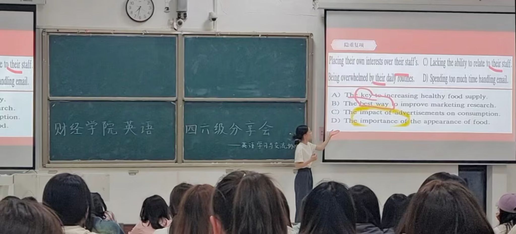 为帮助学生高效备战英语四六级考试,5月21日晚,财经学院在致知楼C111教室举办了英语四六级经验分享会。国际经济与贸易专业211班沈艳雯,会计学专业211班李荣荣两位同学应邀做经验分享。会议由辅导员尹成超老师主持。