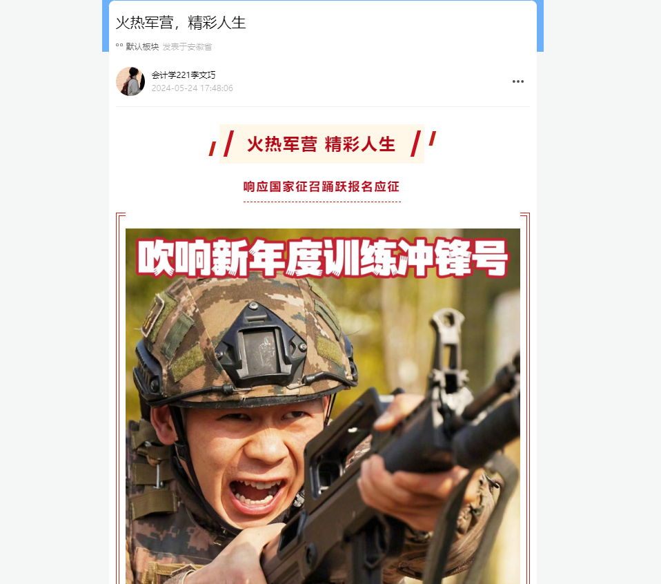 为鼓励大学生积极参加2024年秋季应征入伍,更好了解秋季征兵工作政策及流程,财经学院各班级于5月下旬开展应征入伍政策宣传咨询周系列活动。