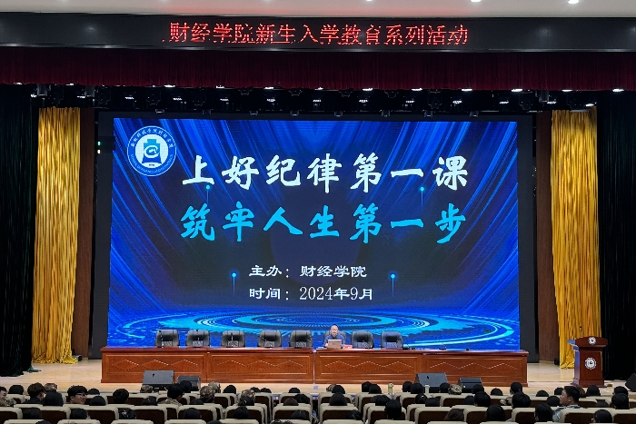 为深入推进校园精神文明建设,引导学生树立规矩意识,帮助青年系好大学的“第一粒扣子”,9月23日晚财经学院在龙湖校区东辅楼报告厅开展主题为“上好纪律第一课,筑牢人生第一步”的校规校纪集中教育大会。学院党委副书记、纪委书记耿广汉主讲,全体辅导员和2024级全体新生参加。