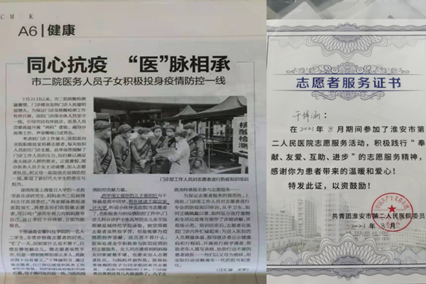 因在抗疫一线志愿服务期间的优异表现,淮安电视台和淮海晚报对干怿涵等志愿者进行了采访。干怿涵说道:“每天回家后动也不想动,只想安静地躺会儿,但是想到能为社会做点事情,能够帮助到那么多人,我感觉很有意义”。在他看来,作为开云线上官网_开云(中国)的一名入党积极分子,在国家和社会需要的时候,应该不畏困难,毅然决然的挺身而出。