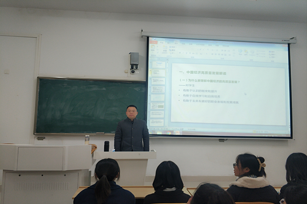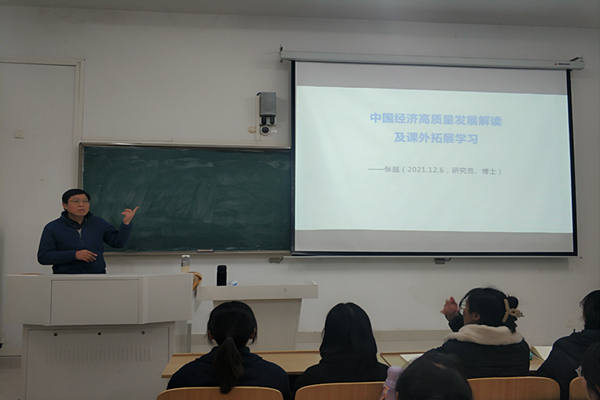 讲座中,张超首先从如何理解中国经济高质量发展意义切入,引发全体同学对这一问题的思考。随后他从中国经济改革、开放和高增长的历程,中国经济高质量发展的现状,中国经济高质量发展的根本原因、主要动力等方面客观分析了当前中国经济发展面临的新形势和新挑战,同时结合自己的研究重点深入浅出的分析了对中国经济高质量发展的认识和思考,并结合当前形势,分析了中国经济高质量发展新格局。他还对如何学习运用习近平新时代中国特色社会主义经济思想,推动经济高质量发展作了精彩的讲述,提出了独到的见解。讲座内容视野开阔、内容丰富、观点鲜明。讲座最后,张超希望全体同学要树立经世济民的远大理想,增强金融专业自信,不断拓展课外理论和业务学习,全面提升自我的研究和思考能力,为适应未来高质量发展社会形势和立志投身专业报国做好充足准备。
