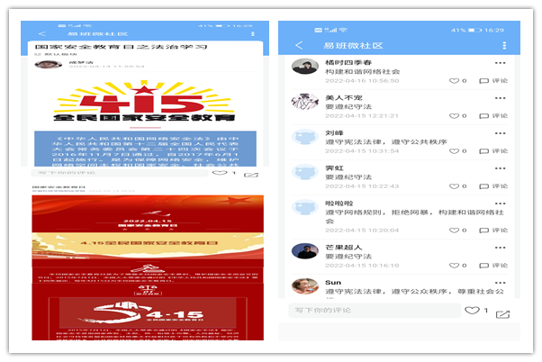 学院充分利用学院易班平台、官方微信公众号等新媒体的育人优势,以学生喜闻乐见的形式开展线上国家安全教育主题宣传。向学院学生传达国家安全教育日标志所代表的含义:数字4的设计,形似宣誓的动作,代表了全国人民誓要维护国家安全的决心及“安全有我”的个人责任感;红星在数字上方闪耀,意指在党的领导下,国家安全得到全面加强,光明前景催人奋进。同时引导学生在易班微社区、评论区留言互动,提升学生参与感。