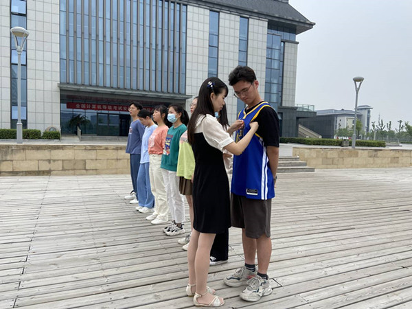 学院纪委副书记、团委书记薛枫为学院2022年7名新发展团员佩戴团徽。