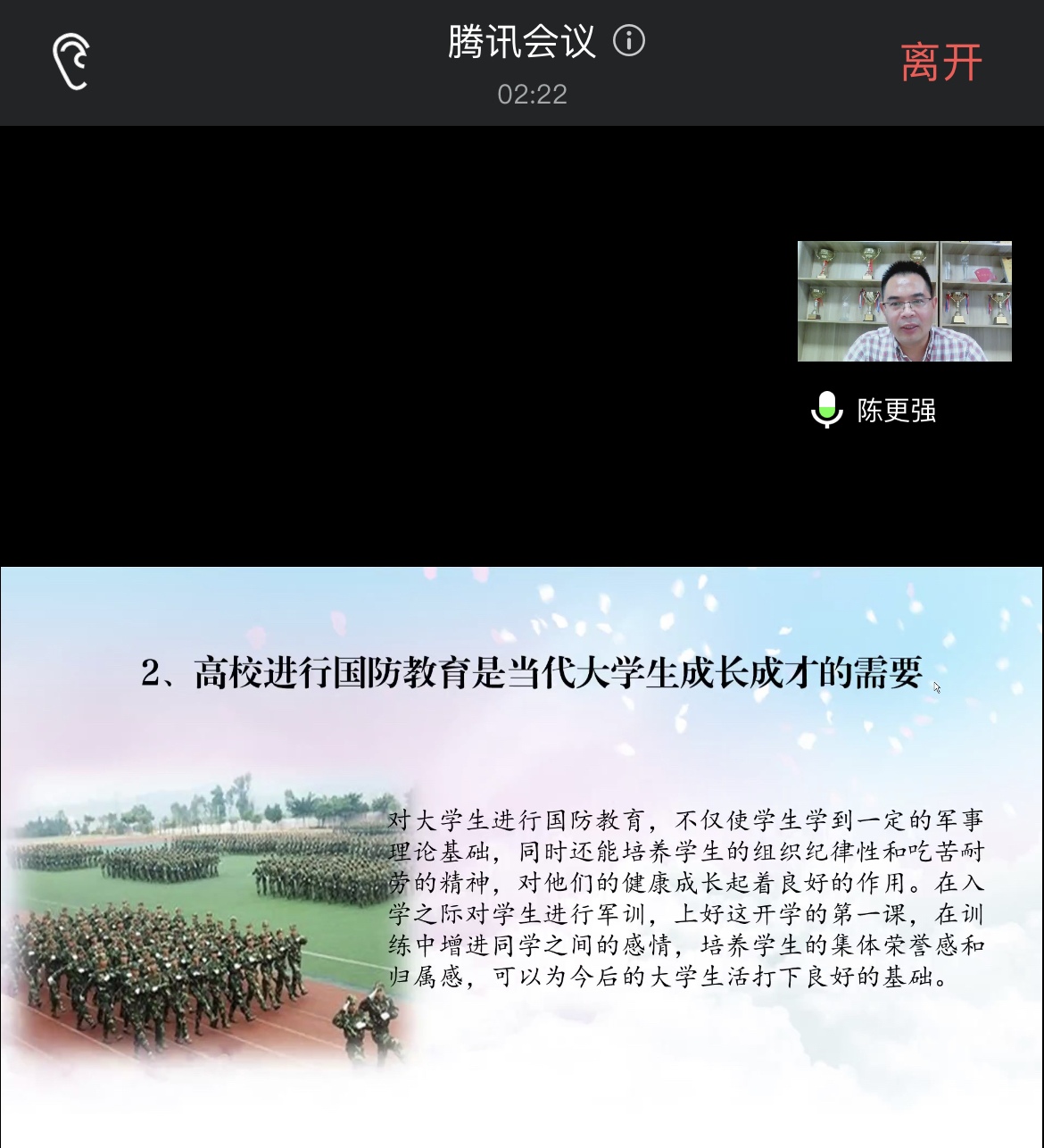 会上,陈更强以大学生国防教育为主题进行讲授。他指出,国防教育具有很强的综合育人功能,对提高大学生的思想道德素质,特别是在增强忧患意识,培养全球视野,激发爱国热情,增强社会责任感等方面具有十分重要的意义。