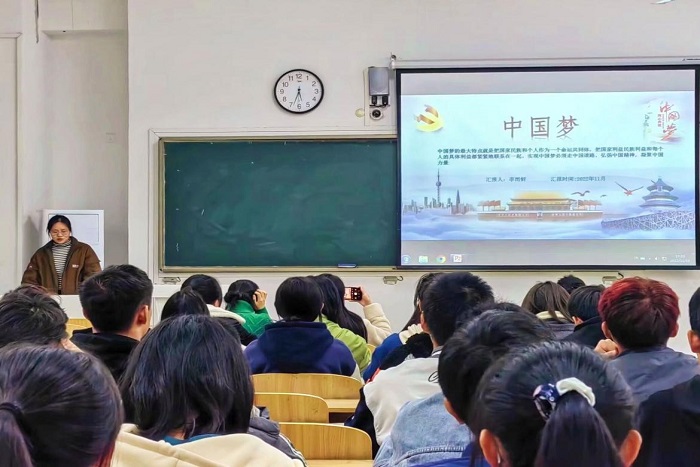 会上,首先李雨鲜向同学们阐述了中国梦的具体含义,她通过对习近平总书记话语的解读,使同学们了解实现中华民族伟大复兴,是近代以来中国人民最伟大的梦想。当今我国正在一步一步的迈入新时代,她以“两个一百年”奋斗目标激励学生,强烈提倡作为新时代青年应当坚守立场、恪尽职守,为国家兴旺发展目标奋斗终生。最后,她以习近平总书记提出的“中国梦接续了毛泽东、邓小平强调的中华民族要为人类做较大贡献的思想”激励青年学生,在思想上对‘中国梦’有更深刻的理解,不忘初心,砥砺前行,向着伟大的中国梦前行。