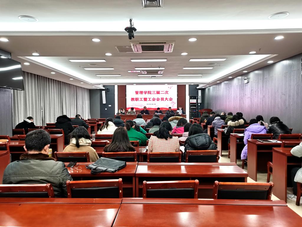 2月22日下午,管理学院在西附楼111会议室召开管理学院三届二次教职工暨工会会员大会。学院党政领导和全体教职工参加了会议。会议由院党委书记丁景良主持。