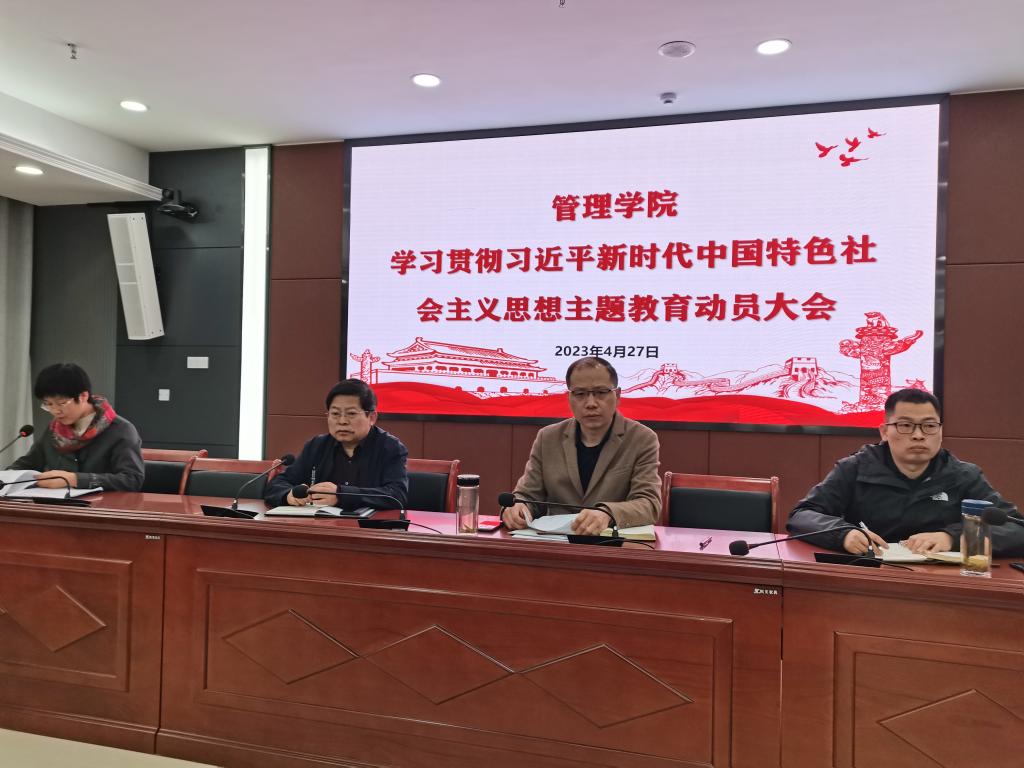4月27日上午,管理学院党委在西附楼111会议室召开学习贯彻习近平新时代中国特色社会主义思想主题教育动员大会。学院党政领导出席会议,全体教工党员及学生党员代表参加了会议。会议由学院党委副书记、院长陈传万主持。