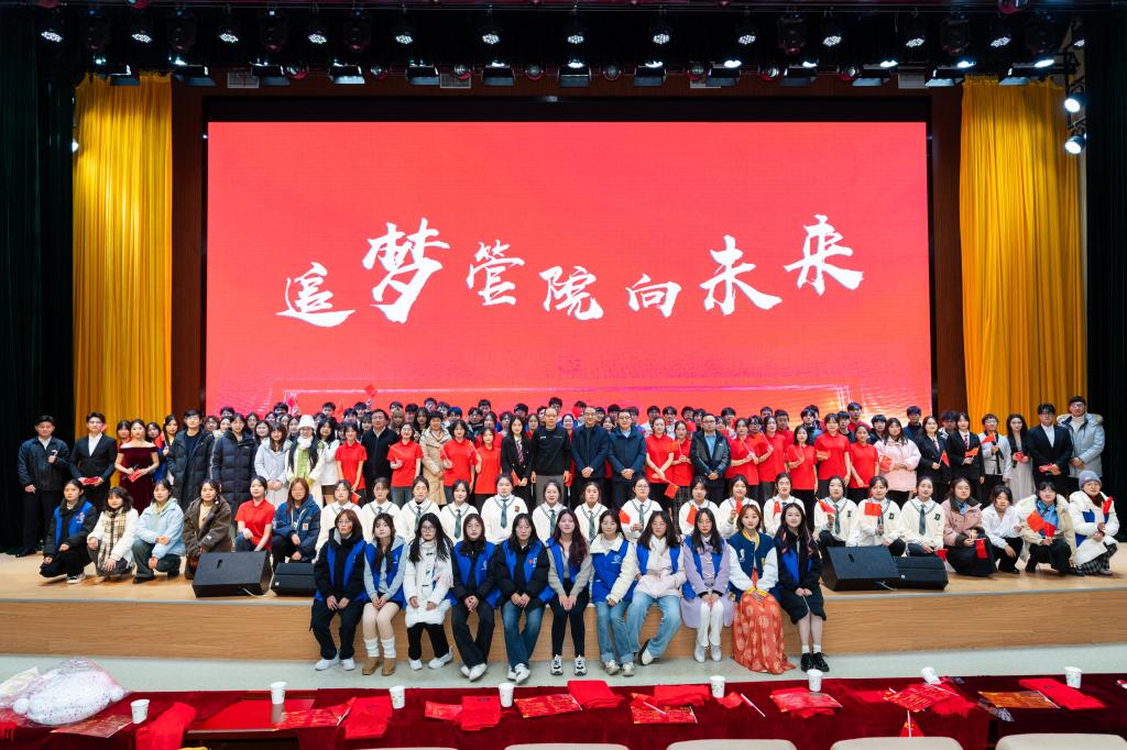 流光溢彩迎新页,追梦管院向未来。12月20日晚,管理学院2023年迎新生文艺晚会在龙湖校区东辅楼举行。管理学院党委书记丁景良,招生与就业工作处副处长何晓冬,党委学工部副部长、学生处副处长陆双双,管理学院党委副书记、纪委书记陶漫及全体辅导员出席观看晚会。