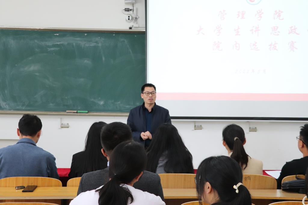 为深入贯彻落实习近平总书记关于深化思政课改革创新的重要指示精神,发挥思政课立德树人关键作用。5月15日下午,管理学院在致知楼B208举办以“青春献礼二十大 强国有我新征程”为主题的大学生讲思政课比赛。马克思主义学院思政课教师赵仁青、黄钦海,管理学院教师武士文、陈凤、李喻受邀担任比赛评委。管理学院副院长张国宝、团委副书记江旭聪到场观看比赛活动。
