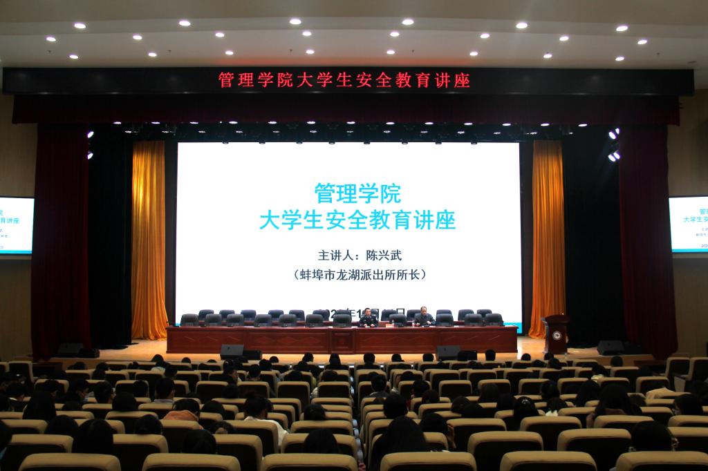 为切实增强大学生安全防范意识,提高学生自我保护能力,根据管理学院2020级新生入学教育方案的安排,11月14日下午,管理学院于龙湖校区综合信息楼东辅楼二楼报告厅举办了新生安全教育知识讲座。讲座由蚌埠市龙湖派出所所长陈兴武(一级警督)担任主讲,管理学院党总支书记丁景良、新生辅导员及2020级全体新同学聆听了本次讲座。