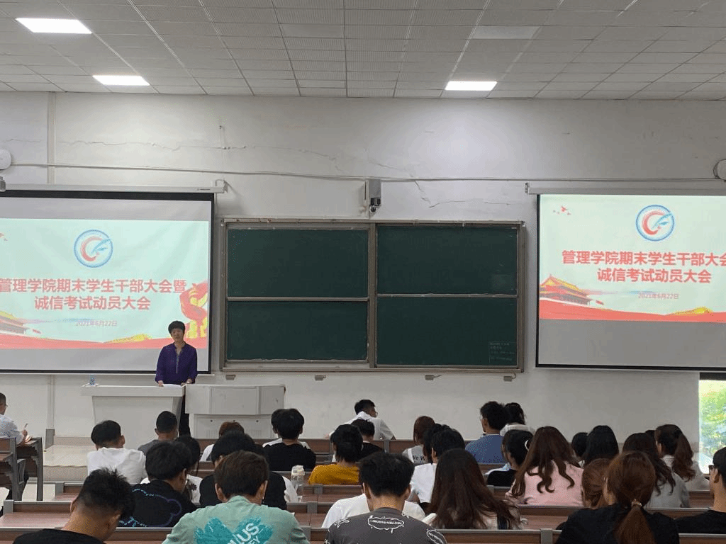 为加强学风建设,严肃考风考纪。6月22日中午,管理学院在龙湖校区致知楼C111教室召开期末学生干部大会暨诚信考试动员大会,学院党委副书记陶漫,党政办主任李永鹏,团委副书记方辛、江旭聪出席了动员会,各学生班级及学生团体主要学生干部、全体学生党员参加会议。会议由李永鹏主持。