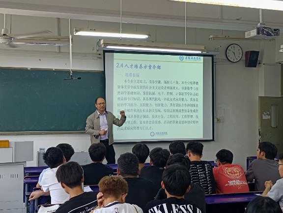 机电控制工程系主任、机械电子工程专业负责人张立勇博士首先介绍了机械电子工程专业的发展背景、专业内涵和就业方向等,重点从工程教育专业认证角度,对机械电子工程专业人才培养方案(2021版)进行了详细解读,明确本专业培养目标、课程设置、实践教学安排和毕业要求等,并就大学学业生涯规划与同学们进行了交流和指导。