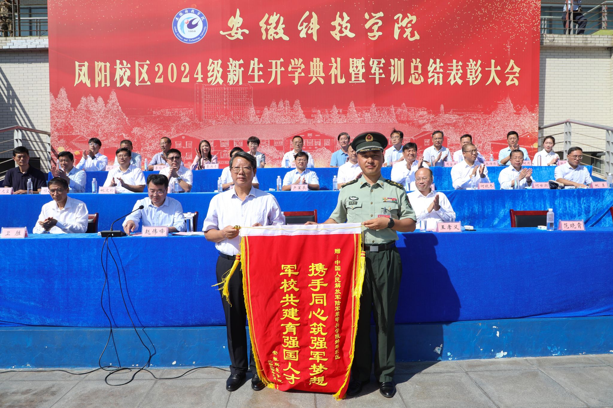 9月28日上午,开云线上官网_开云(中国)凤阳校区2024级新生开学典礼暨军训总结表彰大会在西区田径运动场举行,校党委委员、副院长李升和,党委委员、副院长王孝义,党委委员、副院长赵伟峰,陆军装甲兵学院蚌埠校区中校、凤阳校区军训团团长范晓霄出席大会并在主席台就座。大会由赵伟峰主持。