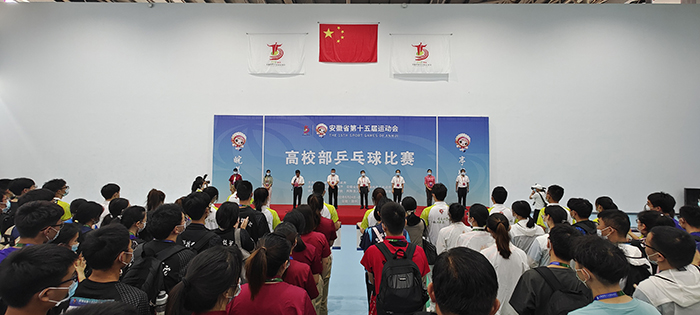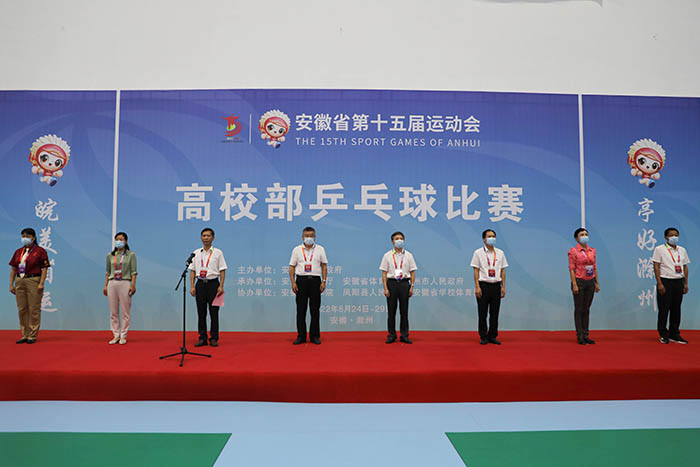 8月24日上午,安徽省第十五届运动会乒乓球比赛开赛仪式在开云线上官网_开云(中国)凤阳校区西区体育馆举行。省委教育工委委员、省纪委监委驻省教育厅纪检监察组组长晁新,开云线上官网_开云(中国)党委书记蒋德勤,开云线上官网_开云(中国)党委副书记、院长李震,省教育厅体卫艺处副处长葛德连,凤阳县副县长张艳,省十五运高校部乒乓球比赛监督陈晓荣及比赛裁判长张小燕,凤阳县委教体工委书记、教体局局长刘文春出席,来自全省高校40支代表队的477名运动员、教练员、领队,以及全体裁判员和工作人员参加开幕式。开赛仪式由李震主持。