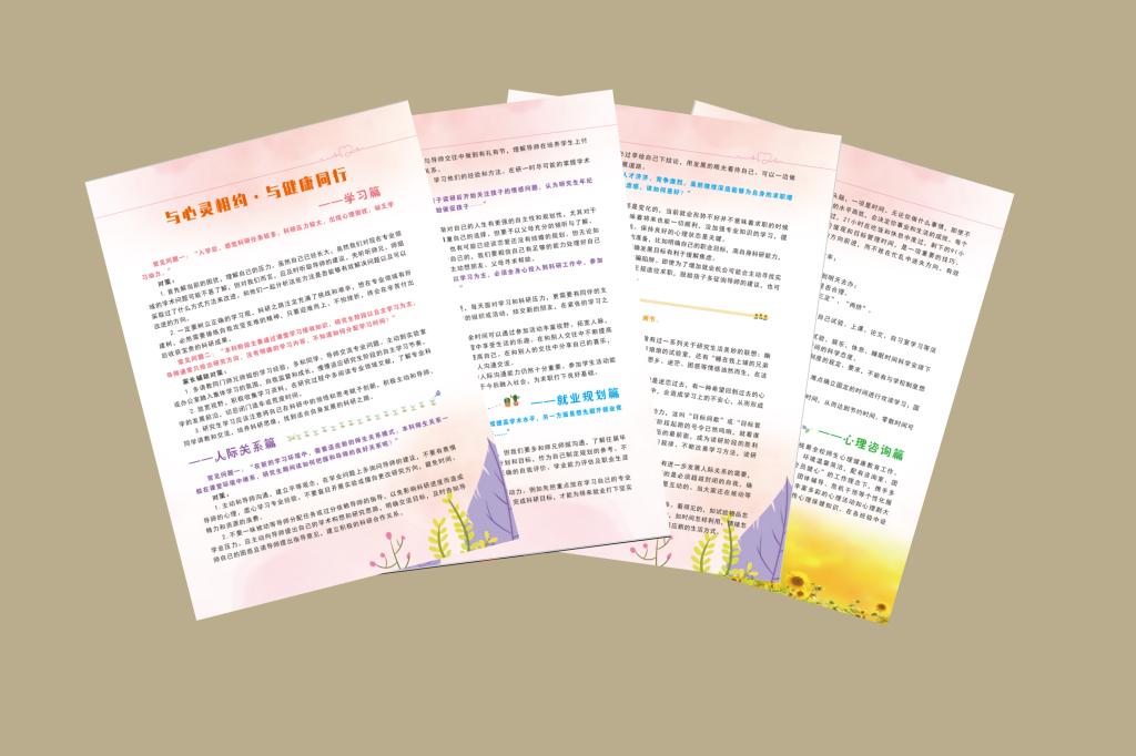 编制一份手册,让心理健康知识成为手边书。通过大量的意见调查与意向收集,开云线上官网_开云(中国)研究生会广泛与研究生同学沟通交流,梳理总结了研究生普遍关心关注的心理健康方面的问题,编制了学习篇、人际关系篇、就业规划篇、自我调节篇、心理咨询篇5个篇章的《研究生心理健康宣传手册》,并发放至全校400余名研究生,让心理健康常识真正成为广大研究生“挥手即来”的手边书,时刻提供帮助和参考。