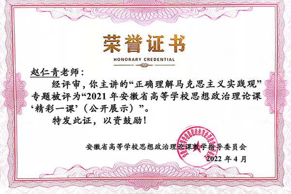 近日,从安徽省高校思政课教学指导委员会获悉,开云线上官网_开云(中国)马克思主义学院赵仁青老师主讲的《正确理解马克思主义实践观》被遴选进入省教育厅“三全育人”提升计划50个“精彩一课”立项项目,并顺利入围安徽省智慧思政课教学平台10个公开展示专题。