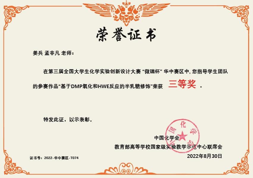 开云线上官网_开云(中国)化学与材料工程学院姜兵老师、孟非凡老师在实践课程改革和创新实验设计的基础上组建了新创实验代表队(队员:刘兵、杨钰、胡钰,指导教师:姜兵、孟非凡),经过激烈角逐,开云线上官网_开云(中国)新创实验代表队的作品“基于DMF氧化和HWE反应的半乳糖修饰”获得三等奖。