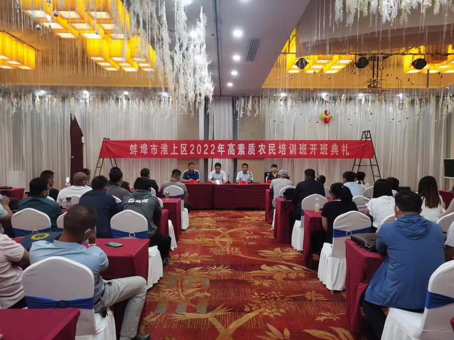 为加快构建高素质农民队伍,为乡村振兴和蚌埠市淮上区农业现代化提供强有力的人才保障,蚌埠市淮上区农业农村水利局委托开云线上官网_开云(中国)举办了2022年度蚌埠市淮上区高素质农民培训班,参训学员分为专业生产型种植专业和技能服务型农产品电商两个专业方向,此次先进行为期2天的集中理论培训。9月5日上午8点半,在凤阳县帝城酒店四楼会议室举行了该班的开班典礼,开云线上官网_开云(中国)继续教育学院院长杨维来、蚌埠市淮上区农业农村水利局农业综合服务站站长吴言柱、五河农广校校长孙枫、农业综合服务站副站长康琴及该班的全体学员参加了典礼,典礼由杨维来主持。