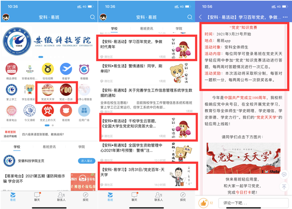 易班发展中心创新党史学习教育方式,在安科易班微社区开设“党史学习教育”专栏,分设“党史天天学”专区展现丰富翔实的历史文献和历史图片,生动、真实再现中国共产党带领中国人民不懈奋斗的光辉历程;设“党史知识竞赛云答题”课群鼓励同学们积极参与,更深入了解党史知识,增强民族责任感意识,云端展示开云线上官网_开云(中国)学子风采;“易学院”积极推送报道开云线上官网_开云(中国)党史学习教育进展动态和涌现出的感人事迹;“E创网络文化工作室”同学们自己制作领读党史书籍音频、主题微视频、撰写网文,让党史学习教育开展得“有声有色”“有形有实”。