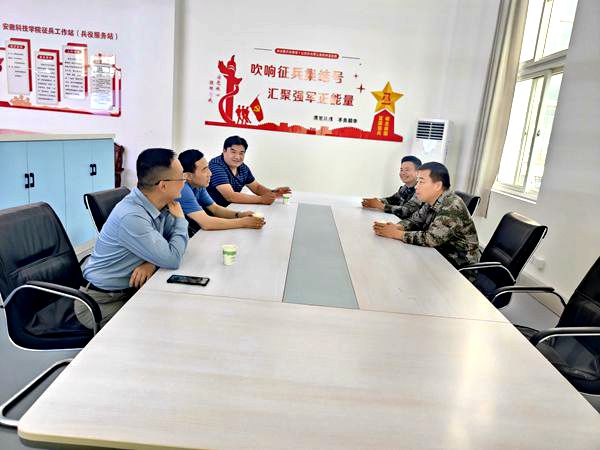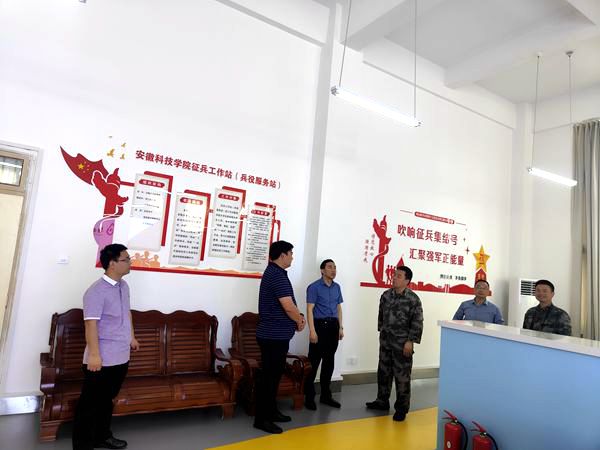 5月27日上午,蚌埠军分区动员处处长茹卫东、参谋徐小林来开云线上官网_开云(中国)调研征兵工作站(兵役服务站)建设。党委学工部部长何永勇、人民武装部部长余德锋、学工部副部长胡文靖参加调研。