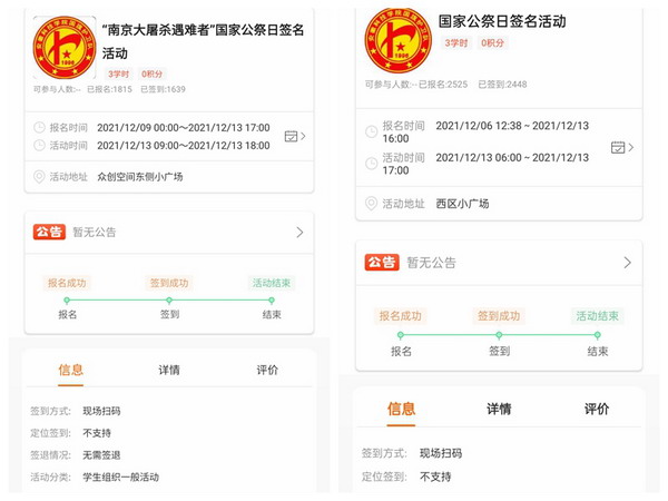 活动现场,凤阳校区西区小广场和龙湖校区众创空间东侧小广场设置国家公祭日宣传展板、国旗护卫队队员向广大师生讲解南京大屠杀死难者国家公祭日的相关知识,宣讲了国家公祭日的意义。在签名活动中,广大同学纷纷驻足在横幅前认真地签下自己的名字,用自己的实际行动来表达对死难者的哀思和对革命先烈的缅怀之情。