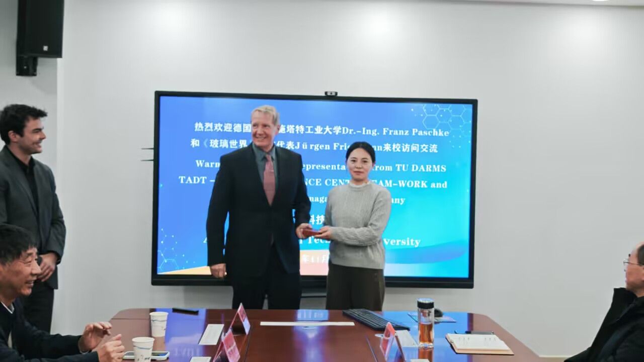 11 月 20 日,“玻璃技术创新与学术合作交流” 主题会议在西附楼317会议室举行。会议邀请德国达姆施塔特工业大学玻璃技术中心全球合作副主席佛朗兹博士、德国《玻璃世界》杂志代表尤根,以及蚌埠市科协、安徽万绿生态公司代表参会,学院领导、教师及2025届材料与化工研究生共同出席。