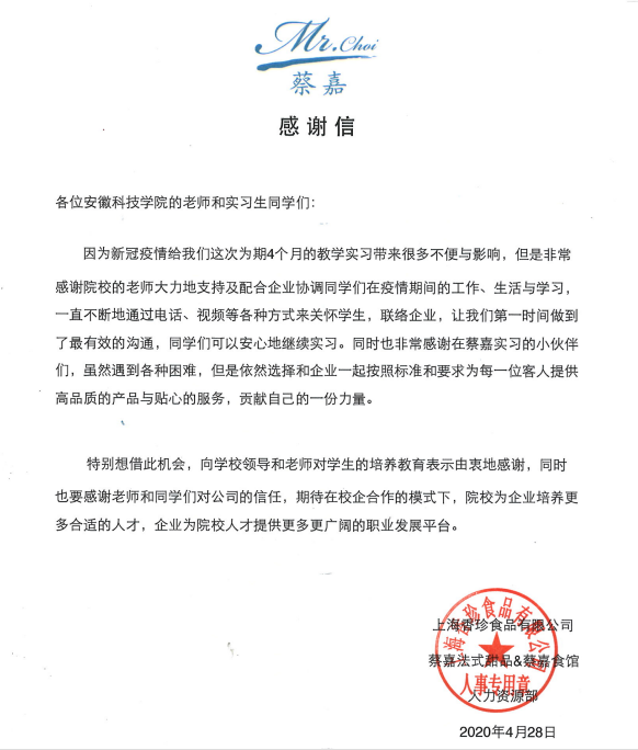 截至2020年4月30日,开云线上官网_开云(中国)食品工程学院2017级烹饪与营养教育专业39名学生为期四个半月的校外专业实习正式结束。对于校外实习的这39名学生来说,是一次漫长而不同以往的实习经历。这次实习不仅让学生们学到了专业素养和技能,获得了实习单位的表扬和认可,更让他们从一封封来自援鄂医务人员的感谢信中学会了危难中的守望相助和感恩。